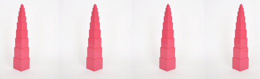 Ten pink wooden cubes varying in size from one cubic centimetre to one cubic decimetre...